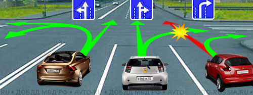Обратите внимание! – теми же знаками запрещено движение прямо с правой полосы. Ну а как же иначе. В противном случае тут постоянно будут биться.
